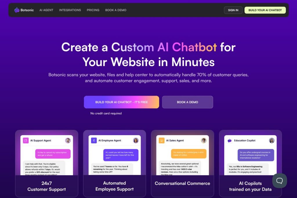 Botsonic does well at rapid knowledge ingestion, multilingual customer engagement, and connecting automated conversations to human handoff. It is well suited for customer support teams, marketing and sales squads that want conversational lead capture, and HR or internal IT groups that need quick access to company policies.