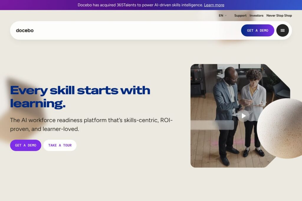 Docebo is an AI-first learning platform designed for enterprise learning, skills development, and customer and partner training on a single system. The platform combines generative AI content creation, skills intelligence after the acquisition of 365Talents, and analytics to connect learning activity to business outcomes like ramp time, win rates, and retention. Organizations use Docebo to centralize multiple learning use cases, reduce admin overhead, and scale programs globally with localization and role-based audiences.