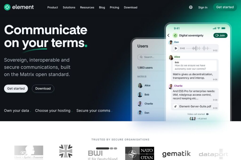 Element is a client and collaboration platform built on the Matrix open standard, providing end-to-end encrypted messaging, voice and video calling, and group collaboration across desktop and mobile. It supports both self-hosted deployments for organisations that require digital sovereignty and managed hosting via Element Matrix Services for teams that prefer an operated option.