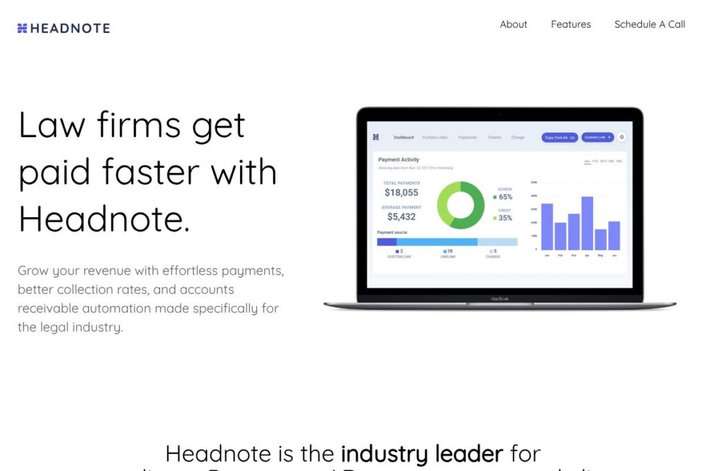 Headnote is used to accept compliant credit card and eCheck payments and automate accounts receivable for law firms. It also captures client feedback via NPS surveys tied to invoices and attorneys.