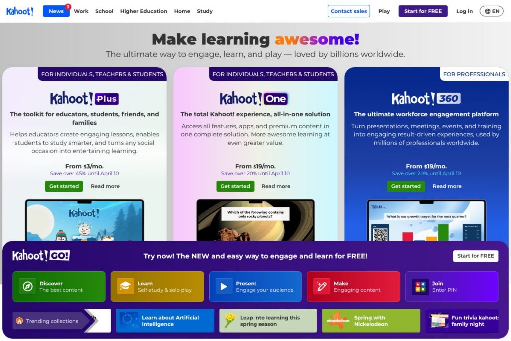 Kahoot! uses a subscription-based pricing model with a free tier and paid plans aimed at individuals, educators, and professionals. Paid plans start at $3/mo for basic paid features and rise for all-in-one or business-level subscriptions, with periodic promotional discounts available.