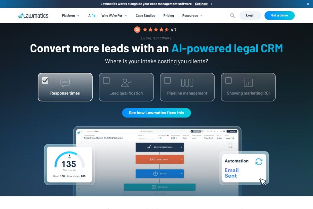 Lawmatics works especially well for small to mid-sized firms that generate significant inbound leads and want to move prospects through a repeatable, measurable intake funnel. Its strengths are intake conversion, automated client communication, and CRM-driven marketing analytics for firms that treat lead flow as a core growth channel. For demos and platform details, visit the Lawmatics homepage.