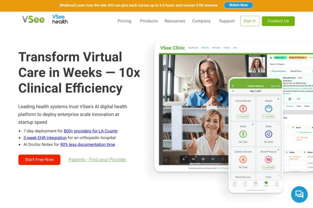 VSee is used for secure telemedicine visits, clinical intake, and workflow automation. Health systems and clinics use it for scheduled visits, triage, and specialty consults that require HIPAA-compliant video and configurable forms.