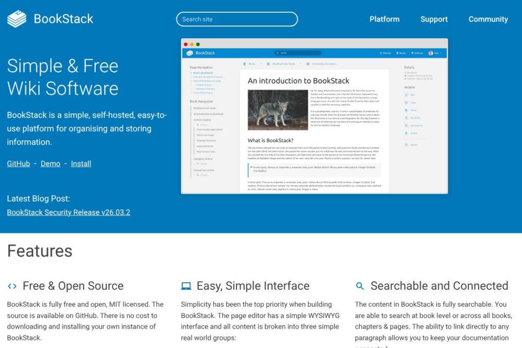 With these features, BookStack delivers a focused documentation experience that emphasizes structure, portability, and secure self-hosting while keeping authoring simple.