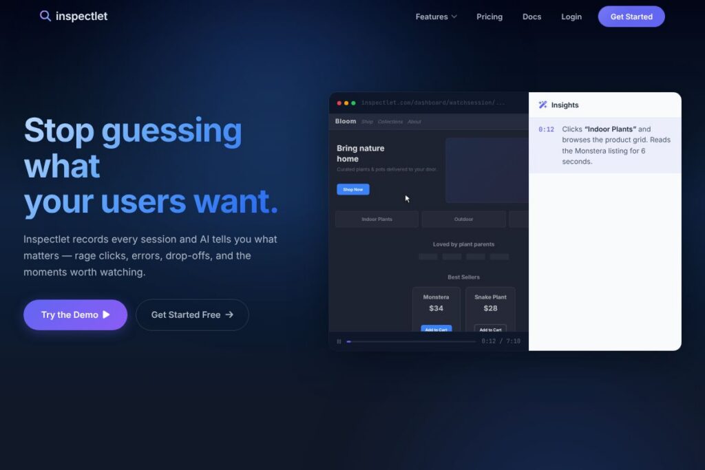 All of this makes Inspectlet especially useful for product teams and UX researchers who need to watch user behavior, reproduce bugs, and quantify form friction. It suits teams that want fast setup via a small JavaScript snippet and prioritized lists of sessions worth watching.