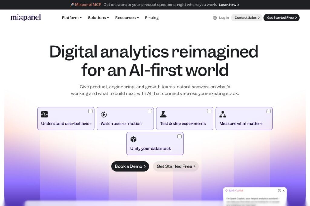 Mixpanel excels at combining event-level analytics with tools that move teams from insight to action, notably session replay, experiments, and feature flags in a single workflow. Its sub-second query performance, AI query assistance, and warehouse syncs make it a solid choice for product and growth teams that need fast, reliable answers tied directly to product changes.