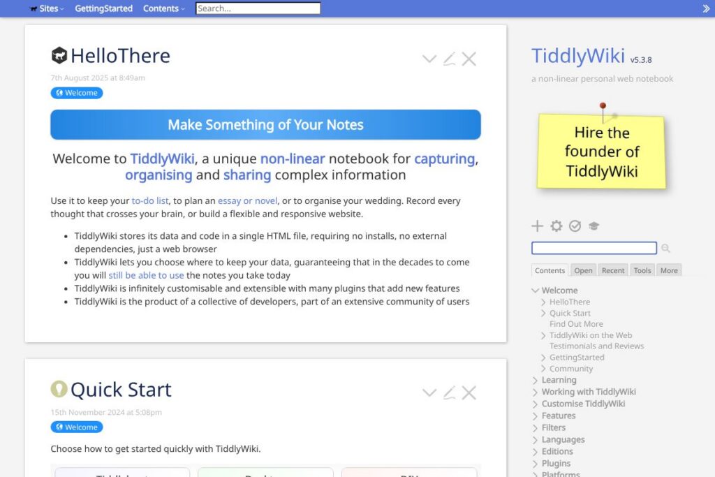 All of this makes TiddlyWiki especially useful for individuals who want a highly customizable, private knowledge base that runs in a browser or as a Node.js application. Its architecture is well suited to writers, researchers, and developers who want to shape the interface and storage to their workflow rather than adapting to a hosted product’s constraints.