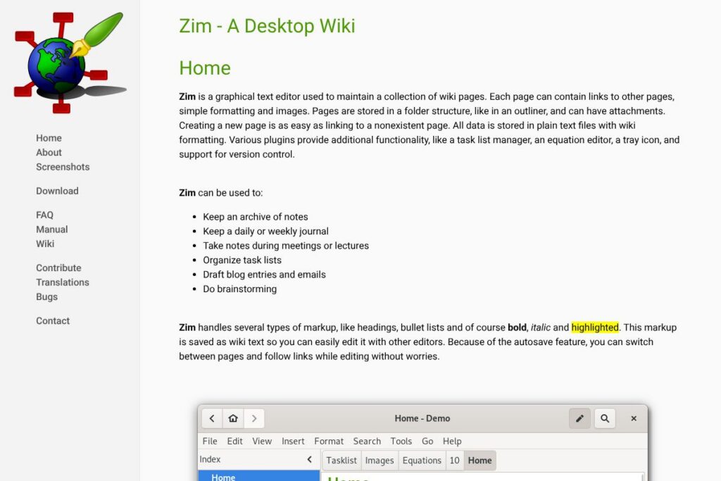 Zim does well when you need a fast, offline, file-based wiki for personal knowledge management, meeting notes, or journaling. It is especially useful for users who prefer editable plain-text storage and local control of their content, and for small teams or individuals who want a no-friction desktop wiki without a server component. Review Zim’s homepage to download the app or read more about its goals and features.